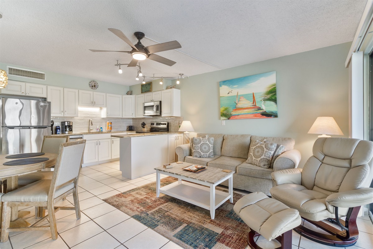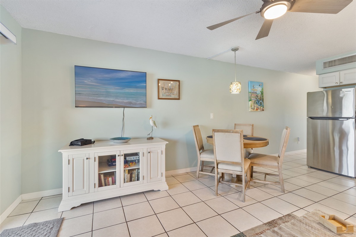 If you decide not to dine on the lanai, our living area also includes a table that comfortably dines four people. This unit comes with free streaming TV and WIFI access. The complex also has a laundry room. Take advantage of the abundant storage spaces, throughout the unit, to make for an uncluttered stay.